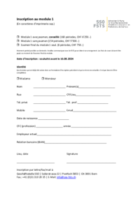 Inscription au module 1 (En caractères d’imprimerie svp.) Module 1 avec examen, conseillé (160 périodes, CHF 6’250.-) Module 1 sans examen (154 périodes, CHF 5’500.-) Examen final du module 1…